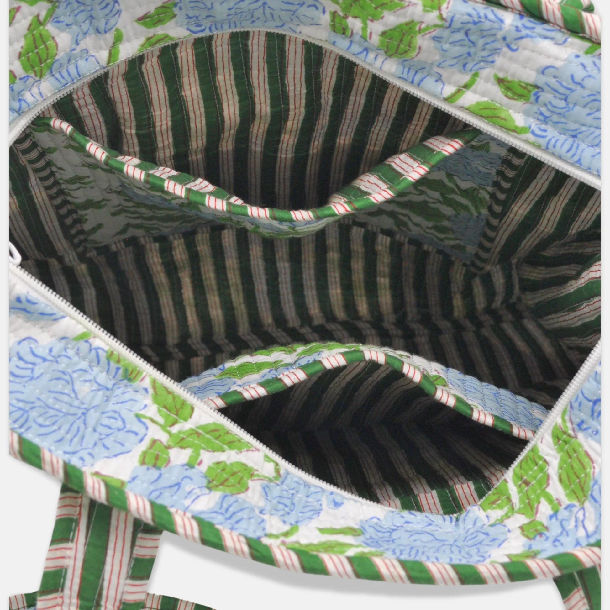 These blue hydrangea quilted tote bags with muted green striped details are specially designed to give you extra space without the bulk, a carryall (literally all) for your mahjong accessories. With an extra long shoulder drop for comfort, each has ample room for tiles, racks, mats, cards, & accessories.