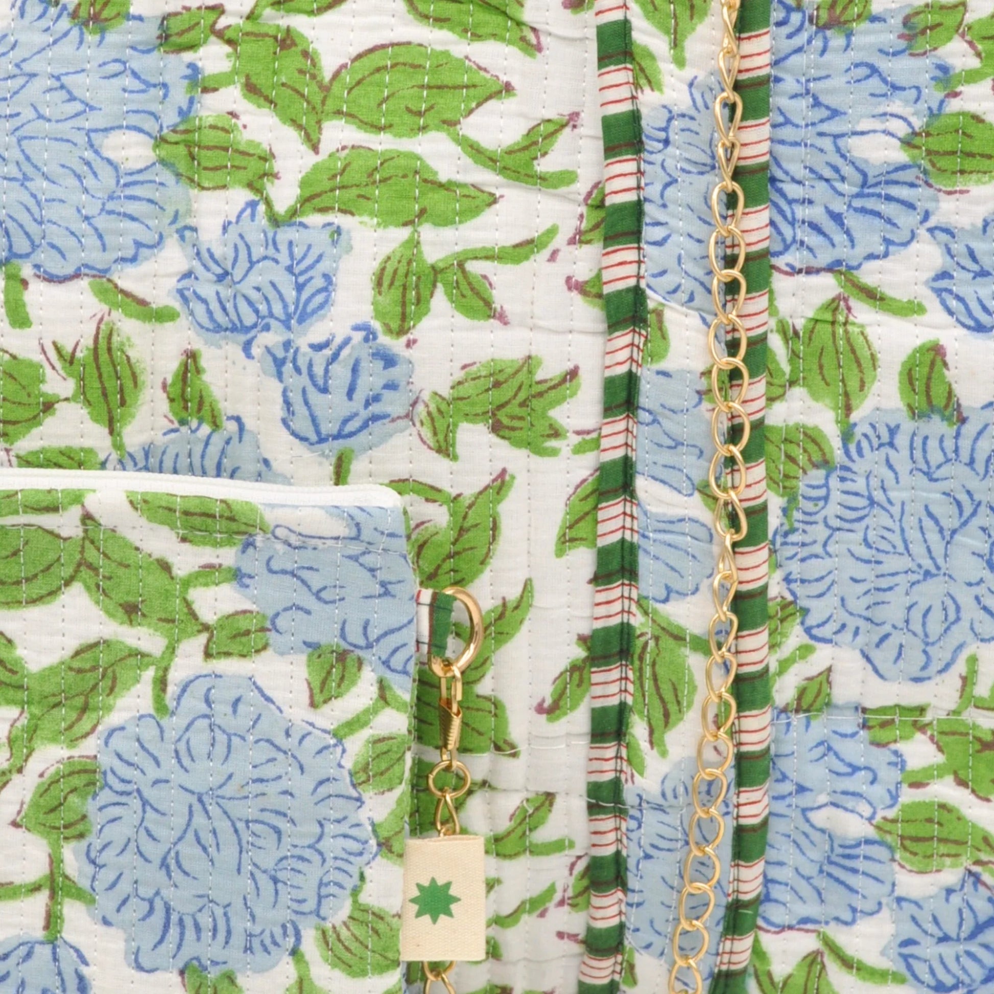 The combination of green striped piping and blue hydrangeas of this design offers a subtle sophisticated softness to your mahjong bag, and the classic gold ring is perfect for the addition of a name tag or chained card pouch. The soft cotton and floral print exude an essence that’s reminiscent of your favorite vintage overnight bag.